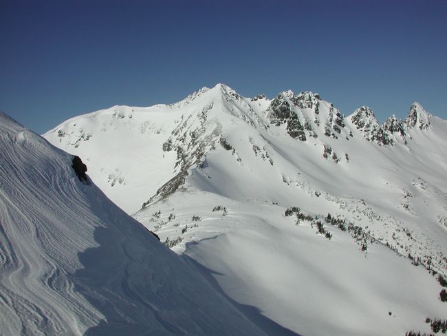 There are a variety of ways we can run this day, each depending on the group's goals and the current snow conditions. Directly above camp, easy slopes lead to the wide Col between peaks 7132' and 7423' for a moderate 1700' descent, or we can take a more aggressive line, tackling a ski mountaineering objective and the summit of Peak 7423' before skiing the steeper slopes to the NE. Once on the West side of the Chiwaukums Range, we make our way south and get into position for the major objective of the trip, the climb and ski of Big Chiwaukum (8081'), the highest peak in the Chiwaukum Range. This night is generally spent at Lake Grace (6242') to the South of Big Chiwaukum.