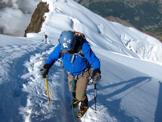 Dufourspitze - Monte Rosa (4634m): The biggest challenge of the Dufourspitze climb is the length. The summit day involves an ascent of 5744 feet. The lower portions of the route involve a moraine hike followed by moderate snow and ice slopes. Eventually we reach a short, steep, snow slope that provides access to a narrow rock ridge that leads to the summit. This day generally takes 10-12 hours from hut to hut.