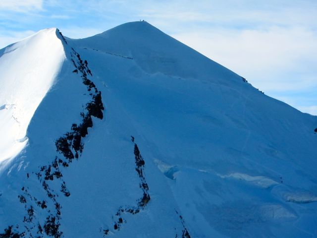 Day 3: Today we tackle the Wiessmies. To reach the climb we hike back up to the Hohsaas and drop onto the Trift Glacier. The route appears improbable as it winds its way up to the ridge avoiding the steepest sections of glacier and thread through an interesting icefall. We generally start in the shade and then gain the spectacular, sunny ridge, that eventually leads to the summit. There is no rock climbing on the route, but snow climbing is very spectacular. Once on the summit we reverse the route, pick up our gear, ride the lift down and return to our hotel in Zermatt.