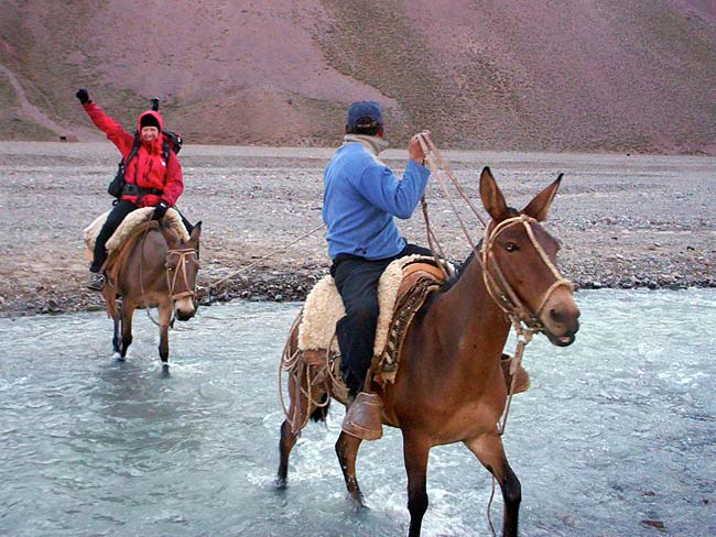 Upon leaving Mendoza we drive several hours high into the mountains to the ski area at Penitentes, where we rendezvous with our outfitter, Fernando Grajales of Grajales Expeditions and our mule drivers. Here in Penitentes we spend an afternoon packing mule loads for the dusty three-day hike into base camp, enjoy one last steak and Malbec feast, spend the night, and then drive to the foot of the Vacas Valley - starting point of the trekking portion of our expedition. Over the next three days we climb from 7,600' to 13,800' making two camps in this austere, arid, and beautiful valley. This helps us acclimate with light packs, while the mules transport the bulk of our gear to the Plaza Argentina, base camp for our Aconcagua summit attempt.
