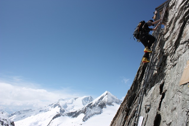 Before heading to the Konkordia Hut we will tackle one of two objectives up the Abeni Flue Glacier above the Hollandia Hut. We will climb either the Abeni Flue (3962m) or the Mittaghorn (3895 m). On past trips we have managed to squeeze both in. The Mittaghorn is a bit more technical and can only be done at a 2:1 or lower ratio. The skiing off the Abeni Flue tends to be the better of the two, but the Mittaghorn is a wonderful climbing objective. After descending one of these peaks we will pass the Hollandia Hut and then undertake the low-angle glacier ski to the Konkordia Hut where will will spend the night. Few will forget the journey up the 150 meters of ladders and stairs that lead to this amazing hut.