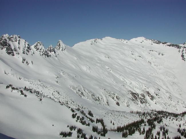 If we were able to ski Big Chiwaukum on Day 2, then this day provides a leisurely trip through somewhat more relaxed terrain enroute to Lake Edna, our final camp. Along the way we have the opportunity to ski some of the 3000 foot runs that drop into the South Fork of Chiwaukum Creek, or to tackle more modest objectives such as Cape Horn (7316). It is possible that we can climb Snowgrass Mountain (7993') the second highest peak in the Chiwaukum Range and ski the huge slopes that make up its East Flank. If we use this day to climb Big Chiwaukum, then the day is a bit busier and we have less time to wander enroute to camp.