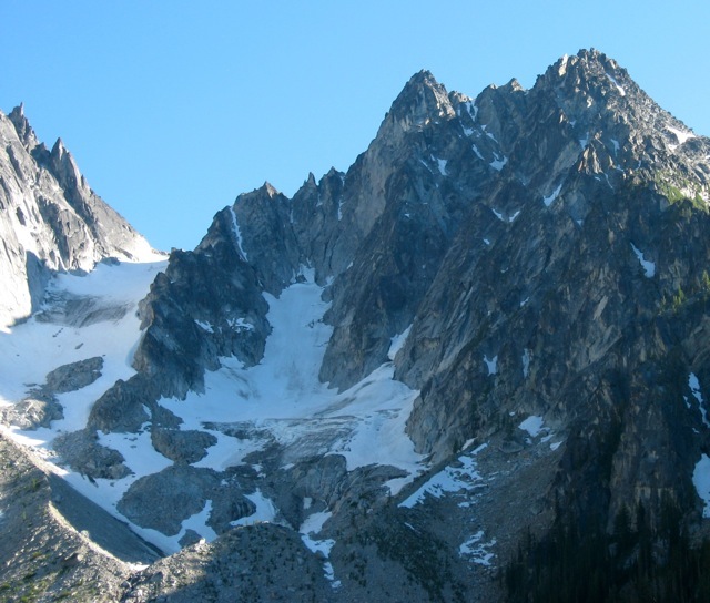 The NE couloir has become very popular in recent years, and is often an alternate destination for those headed to climb the Triple Couloirs Route on Dragontail Peak as it is less steep and committing without the sections that melt out. Basically a steep snow climb, this can only be done when snow conditions are ideal and avalanche hazard is low.Colchuck Peak Itinerary