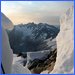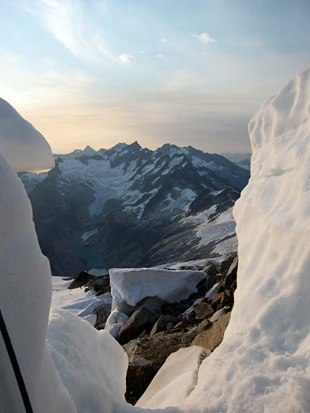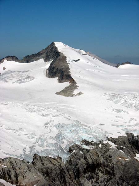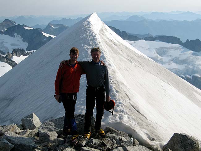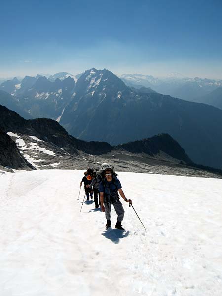 East Ridge of Eldorado Peak: We reach the Eldorado Glacier and eventually the East Ridge of Eldorado Peak by hiking up a steep climbers trail just east of Eldorado Creek, crossing a large boulder field, and eventually climbing to a ridge before scrambling down into the Rousch Creek drainage and the Eldorado Glacier. Most groups camp somewhere below the quickly retreating Eldorado Glacier, and then use nearby snow fields and the glacier itself for training to use the ice axe, crampons, and climbing rope (if participants don't know this already). We then move from this camp up to the base of the East Ridge. The climb itself usually takes about 4 hours from the base of the East Ridge and involves moderate snow climbing and scree walking. You won't soon forget the summit ridge, which is a knife-edged affair with snow slopes falling steeply on either side as you climb the last couple hundred feet to the summit.