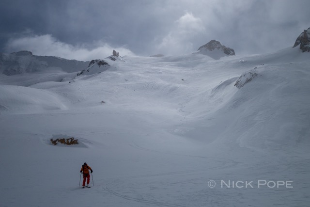 We dedicate a full day to take sample the many options for good touring above the Benevolo hut. Classics include Punta Calabre (3445m-11,302'), Punta Galisia (3346m-10,978') or Becca Traversière (3337m-10,948'). The upper Val di Rhêmes has a wide variety of aspects and elevations that let us sniff out the best skiing. There are also numerous summits that can be tagged with a bit of scrambling; a great warm up for climbing on the Gran Paradiso. We return to the Rifugio Benevolo for a second night.
