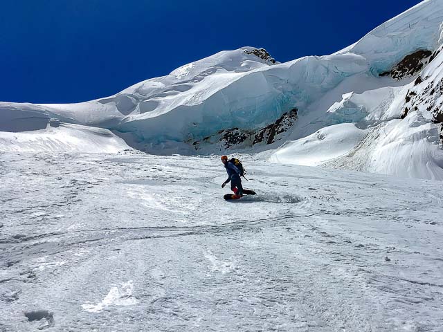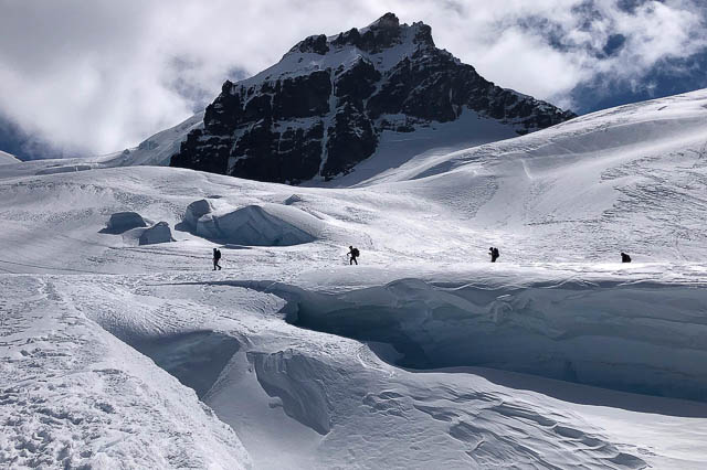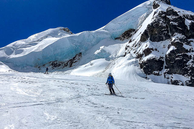On the ski down the guide will have you follow a very specific route through the crevasses and is unroped. From camp we can often ski quite far down valley, but almost always have some carrying to do prior to the trailhead.