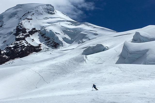 We run these as 1-3 day programs, with the majority opting for 2 days, giving us time to enjoy the hike in, get a few hours of sleep, and time the descent for optimum conditions. Our season generally begins on the north side (via the Coleman-Deming Route) simply because the approach is shorter and by May we are often also using the Easton Glacier on the South side. We consistently see the best conditions in May and early June with additional time carrying your skis at the start as the trails melt out.