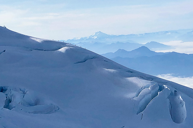 The ascent takes 5-6.5 hours and climbs around 4800’. We usually shoot for about 1000’ per hour with short breaks to adjust clothing, eat, drink, and check-in with one another. In most years the skinning is fairly straight forward up until the Colfax-Baker saddle at 9050’. It is not uncommon to need to use our ski crampons in here and we rope up for some sections. Above the saddle we often choose to carry our skis as the next obstacle, the Pumice Ridge, is often covered with rime ice. Once past the Pumice Ridge we have that last steeper climb up the Roman Wall followed by the traverse across the summit plateau to the actual summit of Baker.