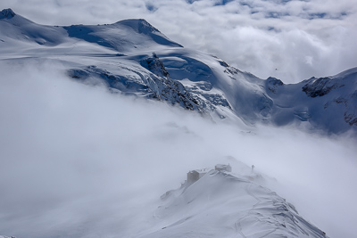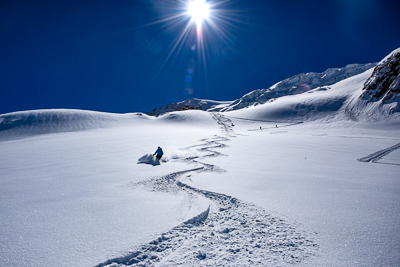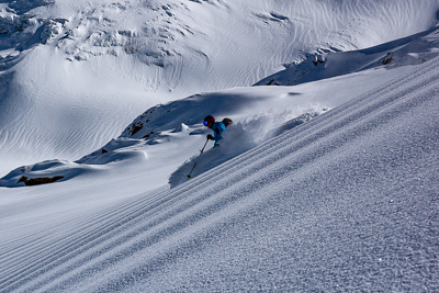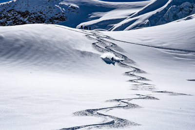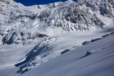 From the top of the Solden ski area we cross over the Passo del Madriccio at 3123m. This sets us up for a beautiful 900 meter east and then north facing descent all the way to the Zufalhutte (2265m).