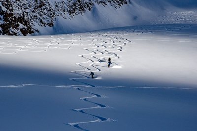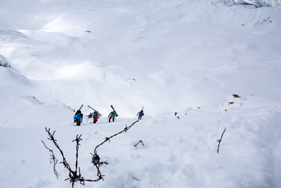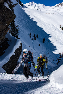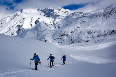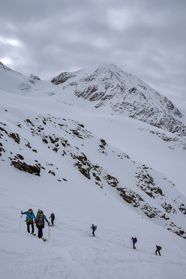 Ski Ability: The Ortler Circuit is not an extreme ski route in any way. It does, however, require participants to be decent skiers. Things you should feel comfortable doing include: skiing with a backpack, skiing a wide variety of snow ranging from powder to breakable crust to corn, and climbing and descending 3500-4500' each day on skis for a week. It is not advised to undertake the Ortler Circuit without any experience outside of a ski area. You will want to do some AT skiing in advance of the Ortler Circuit and will want to show up having used your boots in the time prior to the trip.It is not uncommon for people to develop very bad blisters if they go from not touring at all to putting in successive long ski touring days. You should be able to efficiently get down black diamond runs in most ski areas. Again, you do not need to be an extreme skier to do this, but there will be spots where it is best not to fall, and you need to be able to efficiently link turns in a wide variety of snow conditions. You should also be aware that skiing on a glacier is much different from skiing in bounds at a ski area. Real hazards exist in these mountains and none are marked. Prior to your trip you want to focus on skiing in control and being able to ski for long periods without falling. You do not need any previous mountaineering experience to do this, but it is nice to have some level of familiarity with the climbing harness, crampons, and ice axe. We use these items very rarely, but you will be more confident if you show up with some level of comfort with them.