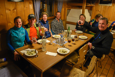 After dropping our overnight gear we generally make a big climb up one of the peaks behind the hut and enjoy a long ski descent back to the hut for the evening. The Marteller is a bit smaller than the other huts and is always fun to visit.