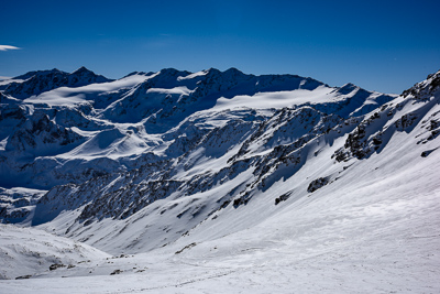 There are several good afternoon tour options in this zone including a ski from the Col Pale Rosso. Ski descents under the south face of the Gran Zebru generally offer long, corn skiing, and are ideal for an afternoon tour.