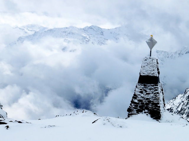 This is one of the more spectacular days and will require decent stability and some visibility to make happen. Our objective for the day is to reach the Schone Aussicht Hut located just over the border in Italy where it is called the Mountain Refuge Bella Vista. We begin with a short descent from the hut and then turn to the west and skin up 360 meters to the Tisenjoch, which is where Ötzi, the iceman, was found and there is now a monument. From here we tour over to the Hauslabjoch at 3276 M (10,748'). From the Hauslabjoch we have the option to climb the Finailspitze 3516 M (11,535'). Like most of the ascents in the area this involves a short scramble at the end over easy terrain that looks a bit improbable at the beginning. The descent to the Schone Aussicht Hut generally has great snow as the glacier faces north and provides really moderate skiing. The Schone Aussicht Hut can also be accessed from the ski area in Kurzras, Italy and is very nice and has spectacular views. This night is spent in the Schone Aussicht Hut, with the Hochjoch Hospiz reserved as an alternate. We would generally make this decision at the start of the trip if we see an issue with the weather forecast.