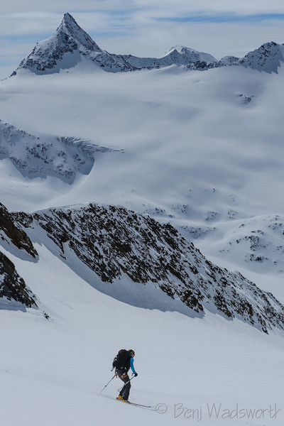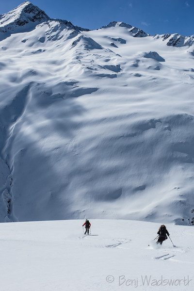 Ski Ability: The Ötztal ski tour is not designed to be an extreme ski route in any way. Participants must, however, be decent skiers. You should feel comfortable skiing with a backpack, skiing the wide variety of snow conditions possible in the mountains such as powder, breakable crust, wind crust, and corn, and climbing and descending 3500-4500' on skis each day for a 6 days. It is not advised to undertake the Ötztal without any backcountry ski experience. You will want to do some AT skiing in advance of the this and should show up having used your boots in the months leading up to the trip.It is not uncommon for people to develop blisters if they do not tour in advance of the trip. You should be able to descend black diamond runs efficiently in most ski areas. Again, you do not need to be an extreme skier to do this, but there will be spots where it is best not to fall, and you need to be able to efficiently link turns in a wide variety of snow conditions. You should also be aware that skiing on a glacier is much different from skiing in bounds at a ski area. Real hazards exist in these mountains and none are marked. Prior to your trip you want to focus on skiing in control and being able to ski for long periods without falling. You do not need any previous mountaineering experience to do this, but it is nice to have some level of familiarity with the climbing harness, crampons, and ice axe. We use these items very rarely, but you will be more confident if you show up with some level of comfort with them. None of the summit objectives involve very extended climbing, but a few are a bit exposed and require careful movement. Most can be skipped while the others climb if you prefer to stick to the skiing.