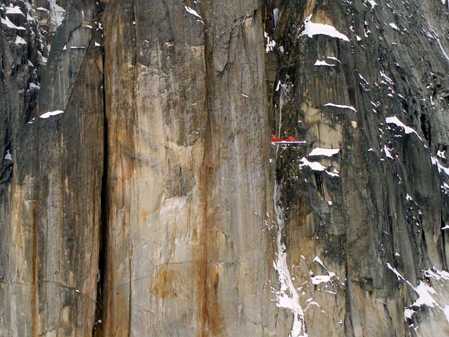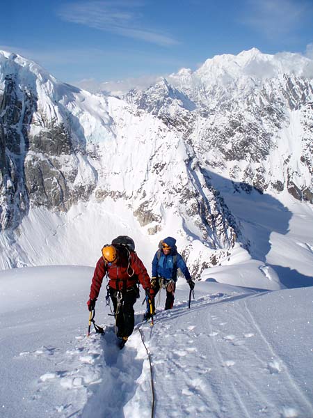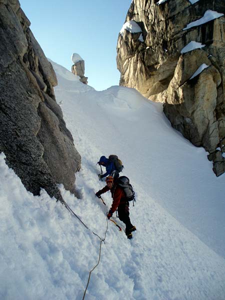 On our 2007 climb we climbed together for speed low on the route and then pitched it out for about 6 pitches near the top of the couloir. Once we reach the top of the couloir the climbing is not over as we still have an exposed traverse and 2.5 more pitches of climbing up to 50° left prior to reaching the summit ridge. Once we reach the ridge we are within 20-30 minutes of the summit and 360 views of one of the most beautiful places on the planet. On Mount Barrill we descend the Japanese Couloir using a combination of rappels, and down climbing.