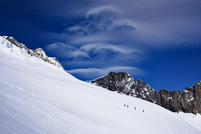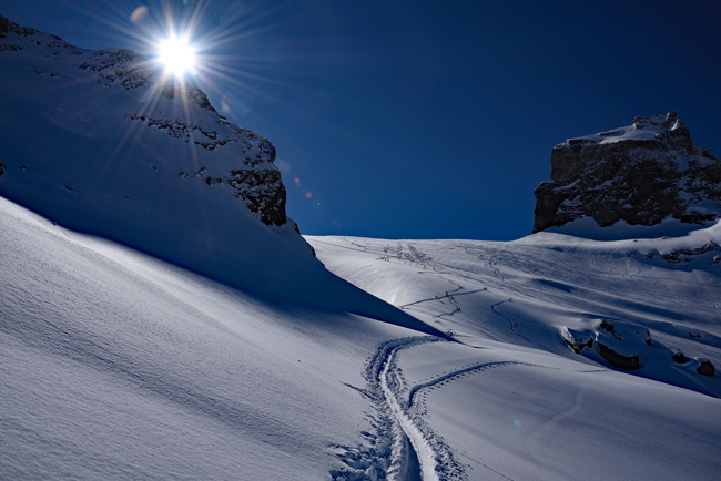 On the final day all of our hard work pays off and finishes with a lot more down than up. We leave the hut and traverse up to the Stössensattel (2760 M - 9055’) and then wrap around a glacier to the ridge on Grassen (2946 M - 9665’) before the long and wild descent into the final valley that leads to Engelberg. Mostly north facing, the final leg of our tour drops us over 1837 M - 6000+’) into a large valley leading to Engelberg. Our tour ends at a small ski area called Fürenalp where we catch a short lift into Engelberg.