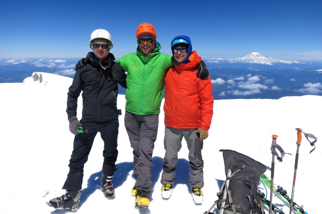 Guided Ski Descents of Mt. Adams: We offer guided ski descents of Mt. Adams in the spring and early summer. While the best skiing is generally earlier in the spring when snow covered roads block access to the Cold Springs trailhead, there is usually a period in the late spring when the road is sufficiently snow free and the skiing is still good. In most years the best time for this is sometime in late May or early June. The trip can be done in a day by those accustomed to 7000’ ski days, or more reasonably, is offered as a 2-day ascent with opportunities to ski various lines in addition to the descent from the summit. Most years the skiing is good in most spots with the exception of the section between Pikers Peak (11,657’) and the summit, which gets such consistent wind that the skiing conditions are rarely good. We often climb to this point and then either decide to carry our skis to the top (primarily so we can say we skied from the summit!) and ski down, or stash our skis, dash up to the summit, and then start skiing from the top of the steeper slopes above the Lunch Counter. There are several routes that can be skied including the popular Southwest Chutes, the Avalanche Glacier Headwall, or more often the South Spur route. If you time it right you can ski most of the way back to your car, but there is almost always a short section that must be hiked the end.