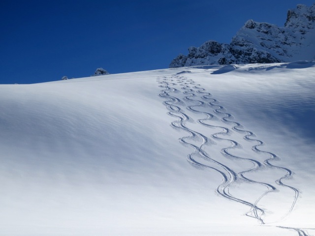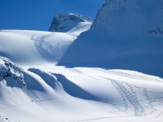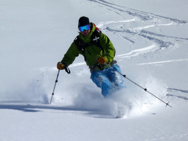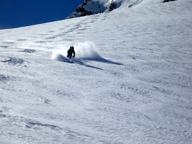 There are a variety of ways we can get to the Wiesbadner Hut, but the most often used is the trip up and over the pass just North of the Dreilanderspitze. This climbs takes a few hours and then drops us onto the NE facing slopes of the upper Vermunt Glacier, which also provides good power skiing down to the Wiesbadner Hut. Along the way we can grab the summit of the Dreilanderspitze (3197M) before skiing down to the hut. In good stability there are more aggressive lines for those looking to challenge themselves a bit.