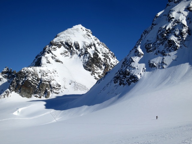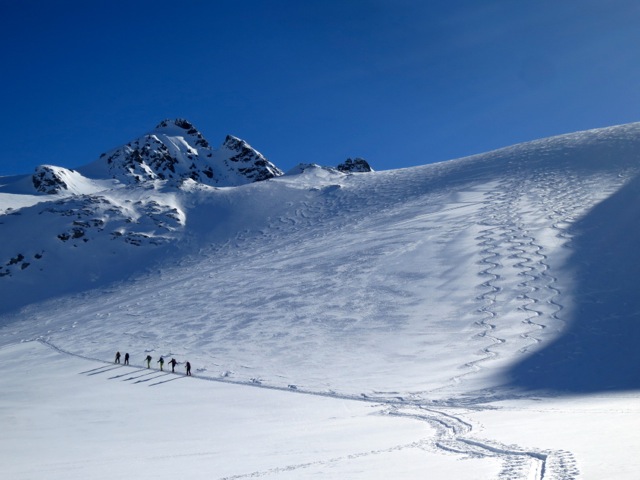 In the morning we collect our gear and then tour up the Val Fenga to the Kronenjoch (2972M) the high pass that leads to the Jamtal Valley where we will spend two nights. The skiing on the backside of the Kronenjoch is consistently very good and along the way we have the option to make the short ascent of the Breite Krone (3079M), which can be ascended on skins with a very short boot section at the end. As usual, there are many opportunities for an afternoon tour for those looking for more vert.
