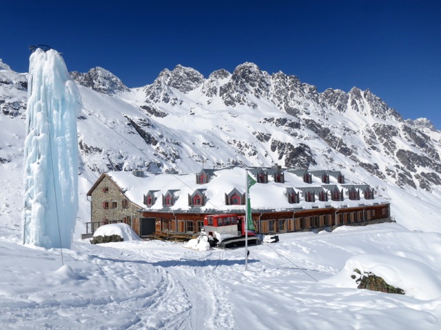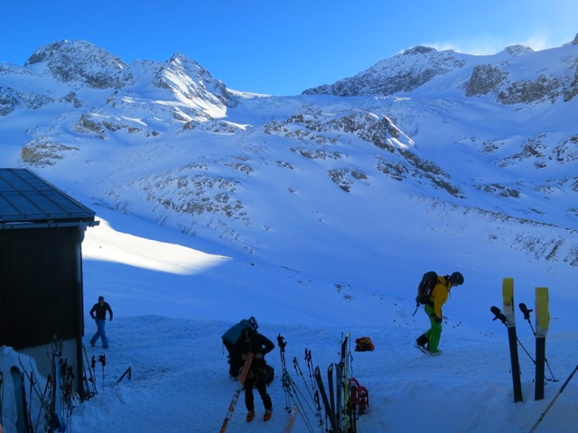 After breakfast in Galtur we take a short bus ride to the ski area at Ischgl where we utilize the lifts to either the Paliner Kopf (2864M) or the new lift to Piz Val Gronda (2812M) and then ski to the Heildelberger Hutte (2264M). Getting to the hut only takes a few hours, leaving time in the afternoon to ski some of the terrain near the Heidelberger Hut.